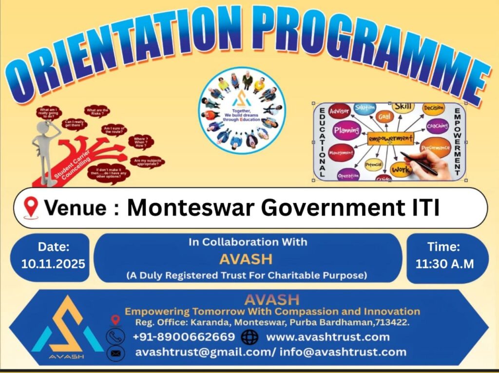AVASH Trust, a socio-educational and charitable organization committed to empowering youth, successfully organized a Student Orientation Programme at Monteswar Government I.T.I, Purba Bardhaman, on 10th November 2025 (Monday).The initiative aimed to provide students with clear academic direction, skill development opportunities, and responsible digital practices to build a confident and future-ready generation. ⭐ Objective of the […]